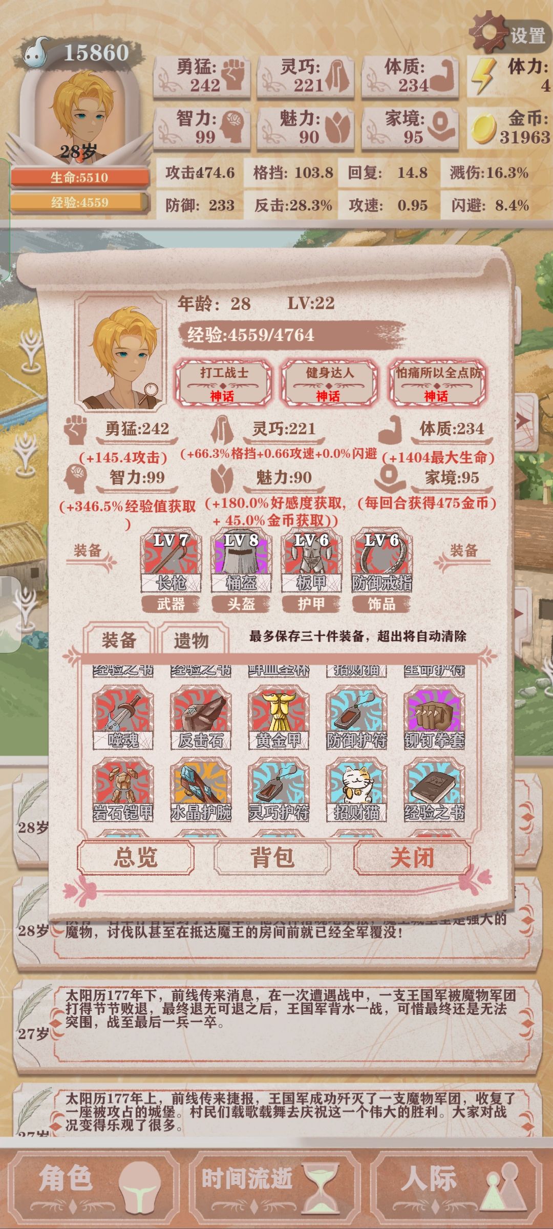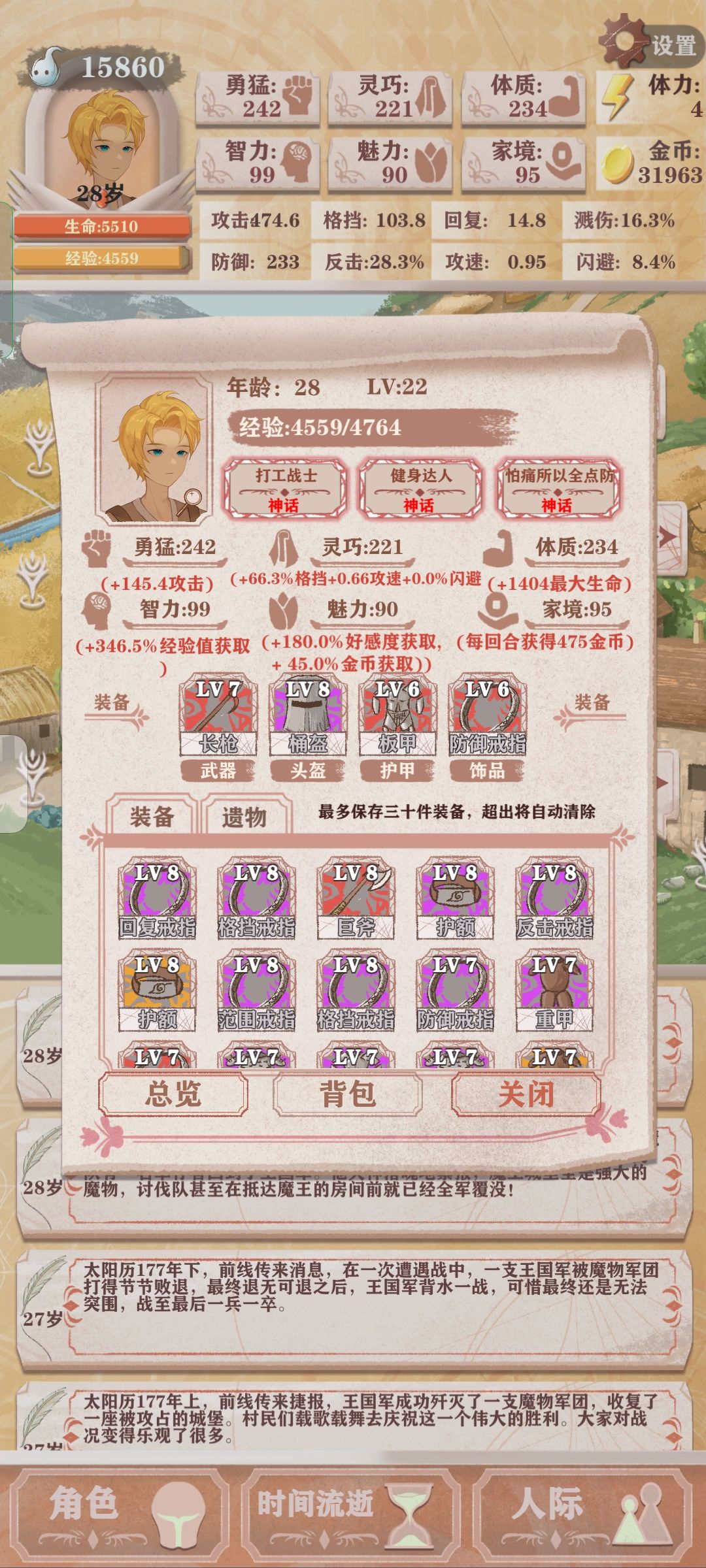 然后开始正式发育,每年先提升勇猛,等攻击力到100后全部提升体质等到200,花点体力吧那个加10智力的任务做了,记得去钓鱼,老婆好感拉满,除了留言板能打的工全打,健身,喝药(先喝到400一瓶就停),功夫奶奶,侏儒学长(智力50小及格70大及格)全买了,你打工加健身,每局拉魅力钱绝对有,后期打三分工就能赚3000多,找的黄金甲和剑,在十八九岁是开始存三万,这时候除了买糖,去酒馆,健身和功夫奶奶不要花钱,这时候因为体质200以上了,就先拉勇猛到200,然后灵巧200,任何时候钱留1000等神秘商店,后期30000以后能花钱提升的全提升,最后格斗要到100,装备方面,巨剑镰刀都行,头盔,重甲板甲反甲,防御戒指格斗反击戒指,根据地图,幽灵图最少200防(最后250以上)兽人图最少250防(最好300以上)不然狂兽人会教你做人,才能正常刷到好装备和足够的经验,防足够的话可以把防御戒指下了,最好带个重甲,boss遗物推荐加溅伤的,噬魂,王者之剑,地图boss遗物推荐哥布林,龙之心,精灵权杖,毒囊,后面最少下三次50体力的兽人本拿装备和遗物,剑圣打得过就打打不过算了。等到下一年就100%前吃个女神雕像刷个兽人本,提前打史莱姆。