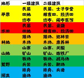 由此,我们可以将建筑大概分为几个类别:军事类(如关隘、靶场等)、特殊资源类(如矿场、士子学堂等)、人口类(如排舟、山寨等)、粮食类(如粮食田、猎场等)与金钱类(如坊市、木场等)。要注意的是,这个分类并不是绝对的,例如战马场既可以提供特殊资源(马),又可以提高战力;鱼塘既可以生产粮食,又可以产生金钱等等。