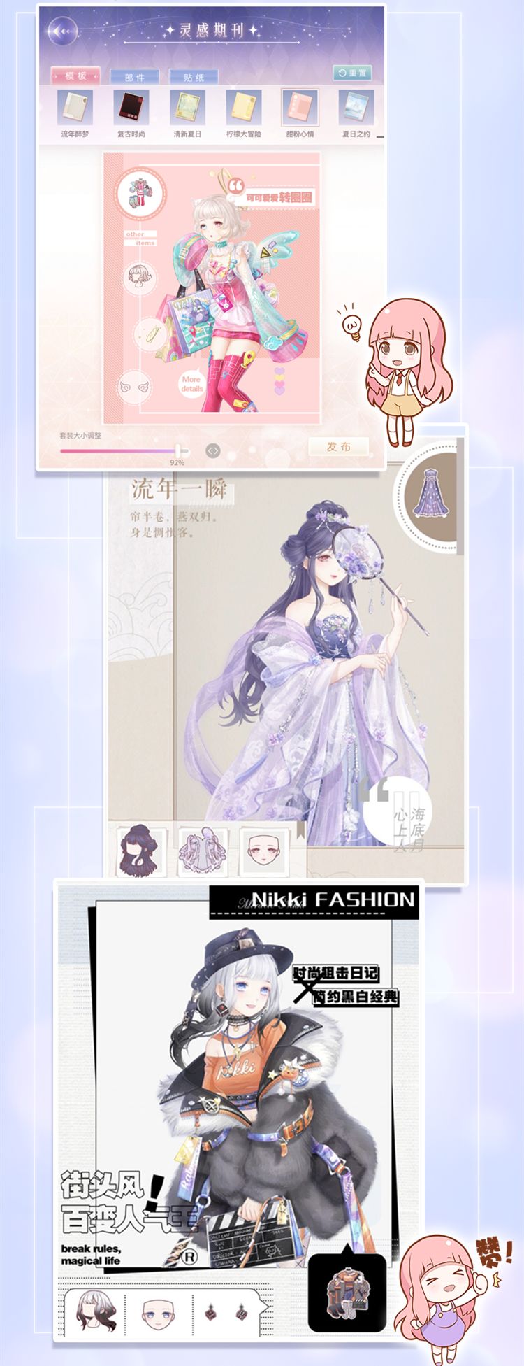 3、创作杂志时,可自由排版服装搭配、杂志模板及贴纸,搭配属于你的时尚杂志。