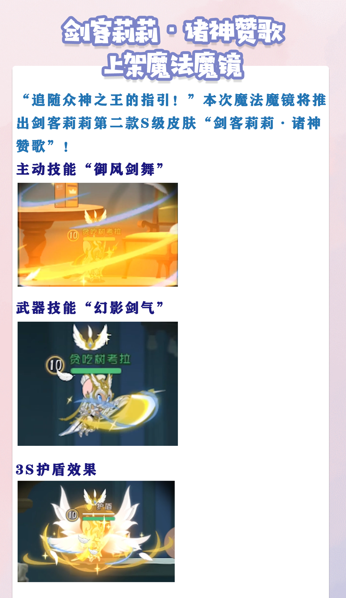 *“追随众神之王的指引!”本次更新后,即将上线全新S级皮肤剑客莉莉·诸神赞歌~您可通过“诸神赞歌”魔法魔镜获得该皮肤。
