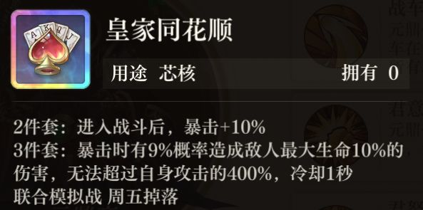 这时候你的小脑袋瓜就疑惑了,同花顺是辅助芯核?诶!还就可以当做辅助核心,当你缺伤害,又没有其他角色可以上,不得不上防御角色,那么前排带上同花顺也可以补足一部分伤害。