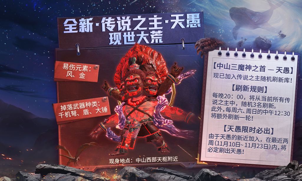 由于天愚封印松动,因此,在天愚上线初期(11月10日~11月23日),每晚随机刷新的三位传说之主中,就会必定出现天愚。