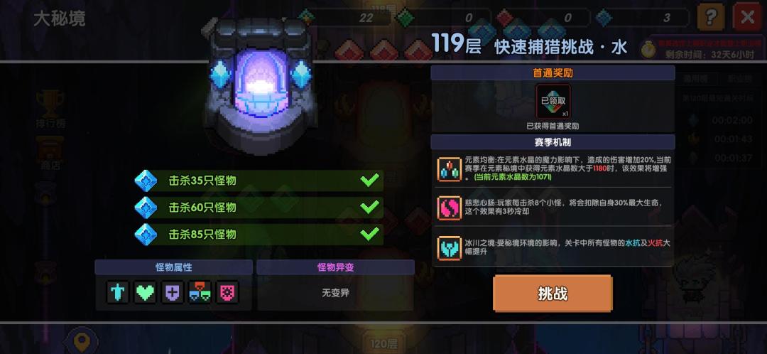 在符文系统解锁前(即第一、二天),尽可能避免消耗体力,非无路可走/完成任务时,都不建议触发精英怪房间和宝箱房间。藏宝地宫同样在符文解锁前,不打