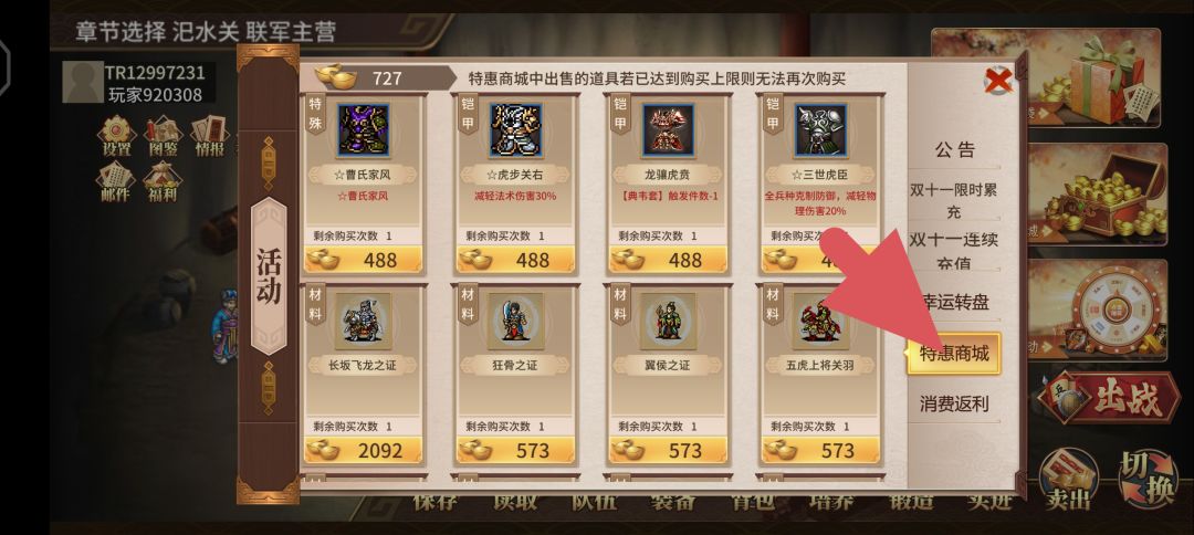 大家都没什么元宝,恨不得一元宝掰成两个用,点开活动,找里边的特惠商城。这里要说一下,除了官服其他的我都统称渠道了,渠道有些装备需要打到特定的关卡才会开放原价购买,如果新人想买,就点击出现旁边的挑战,随便进去一个挑战剧情的出战界面,打开商城,你会发现多了很多原价商城没有的东西,不过特惠商城不影响,买完东西,领取后点击右下角切换,再点击返回即可。