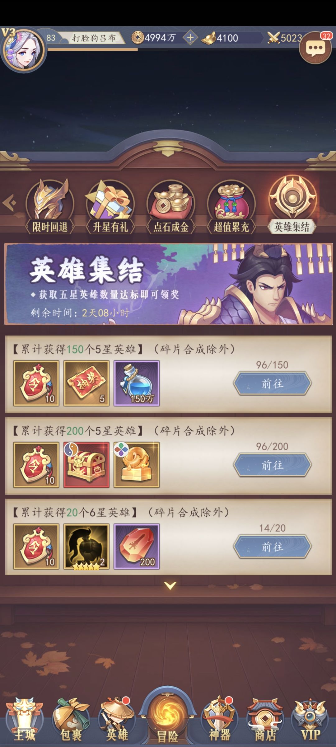 如果说英雄集结5星英雄快到100个了,但是自己某一系升9星还差一些英雄。那么暂停抽卡,保留招募令,等待推进主线和通天塔,剑冢,寻宝的碎片合成。除非是集结的数目85以下,可以考虑抽卡。第二周还有英雄集结活动,第三周有多多益善,抽的越多奖励越好。所以要保留下招募令。