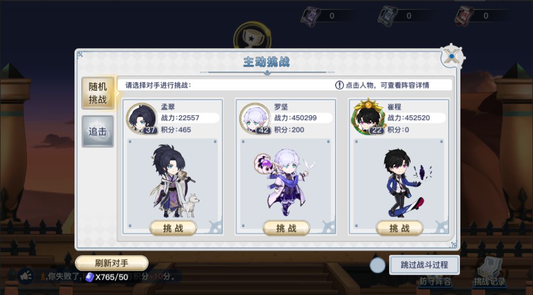 2、挑战:系统每次会随机3名玩家,可选任意一名玩家进行挑战,每次消耗1张【挑战卷】,进攻胜利可获得10分,若进攻失败则扣除5分