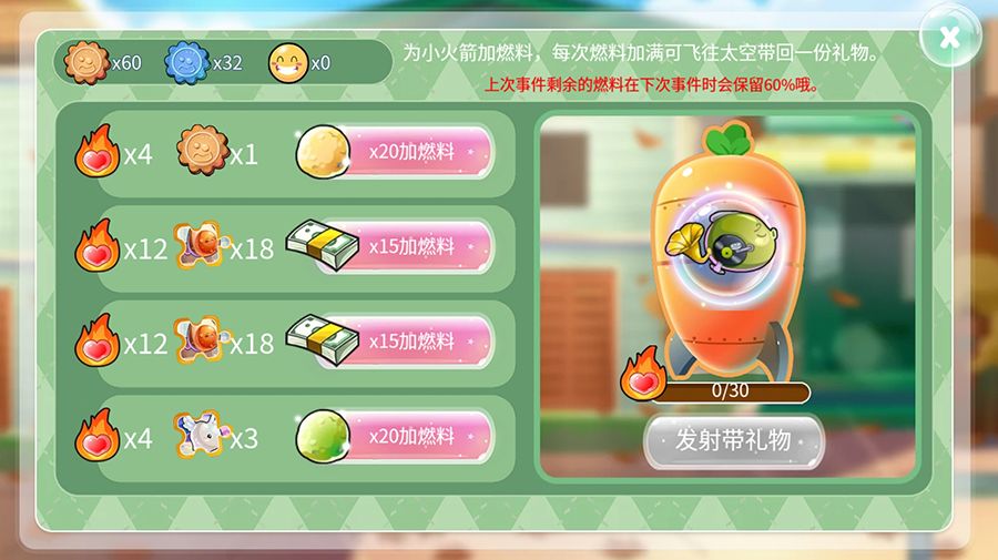 注意:本次事件积累的燃料可以保存60%进入到下次事件中。(例如本次到达关底火箭积累10点燃料,下次再到达关底时将剩余6点)