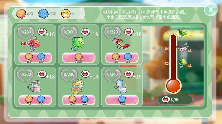消耗小饼干开启抓娃娃小游戏,帮小鱼满足心愿,心愿满足达到100%即可领走对应小鱼啦~