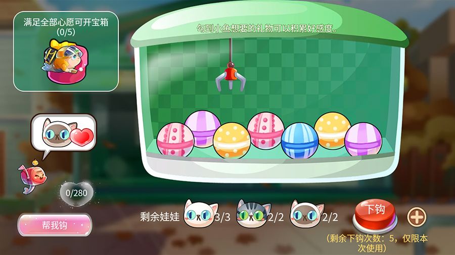 进到娃娃机环节时,需要我们精准下钩,注意左下角小鱼的心愿提示哦~
