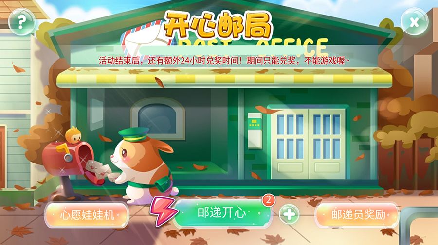 1、本活动分为三部分:邮递开心、心愿娃娃机、邮递员奖励;