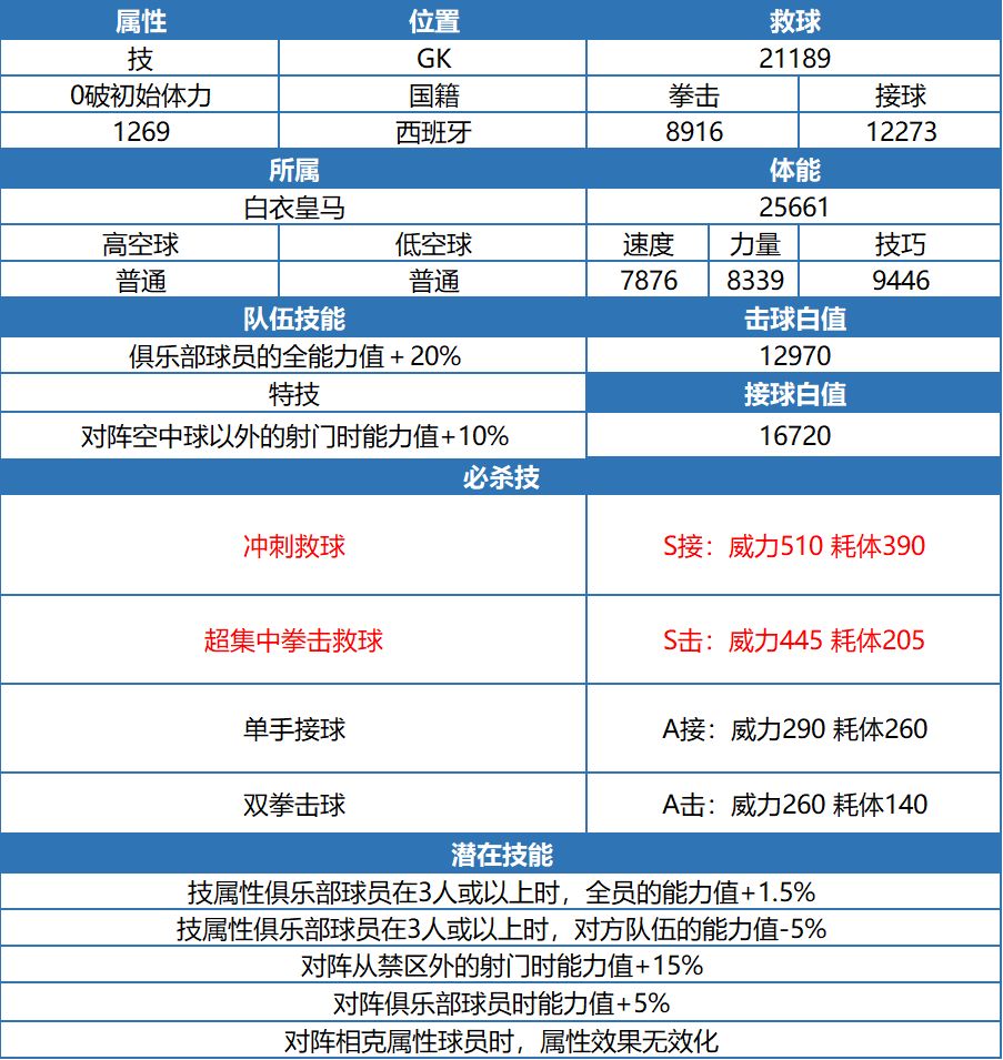 主要能力:克平射10%、克球团5%、克禁区外15%、无视属性克制;