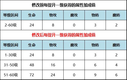 我们将对芋芋的升级属性加成值做出修改。本次维护后,芋芋30级后每次升级所获得的属性提升,将和其他五花角色一样获得对应增幅,兰德洛德已经升级到30级以上的芋芋,将在更新后直接获得这部分属性加成,还请参见修改前后的属性加成值对比图: