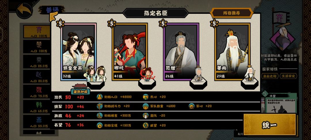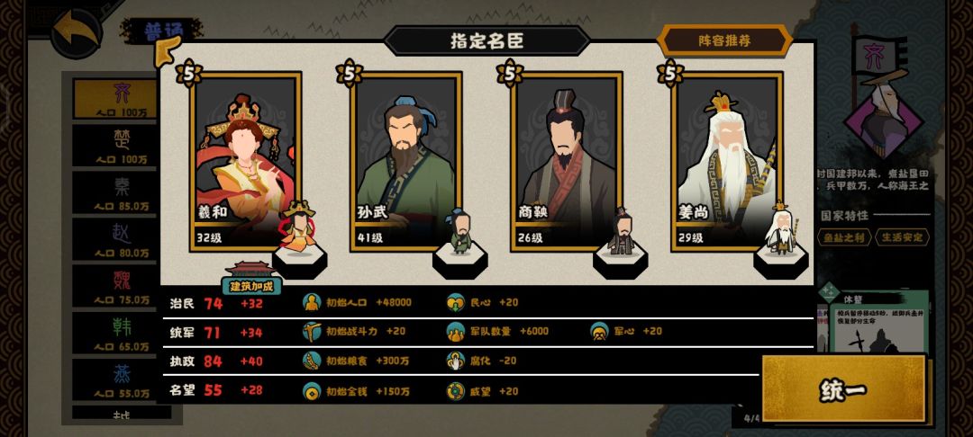 羲和负责加钱粮,孙武负责抢威望,商鞅降低腐化,抢军心,姜尚负责抢民心