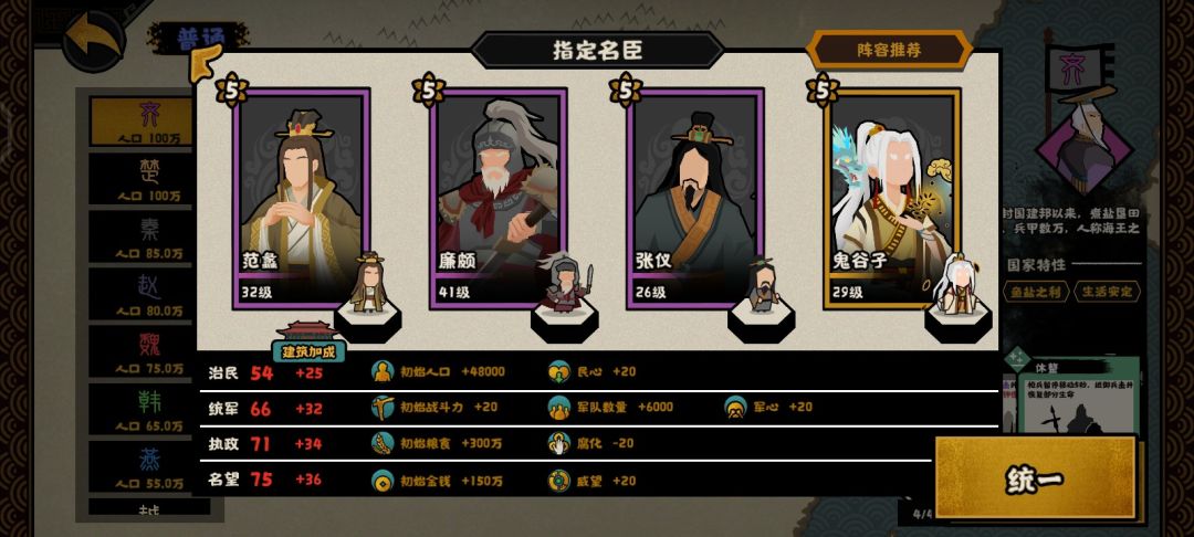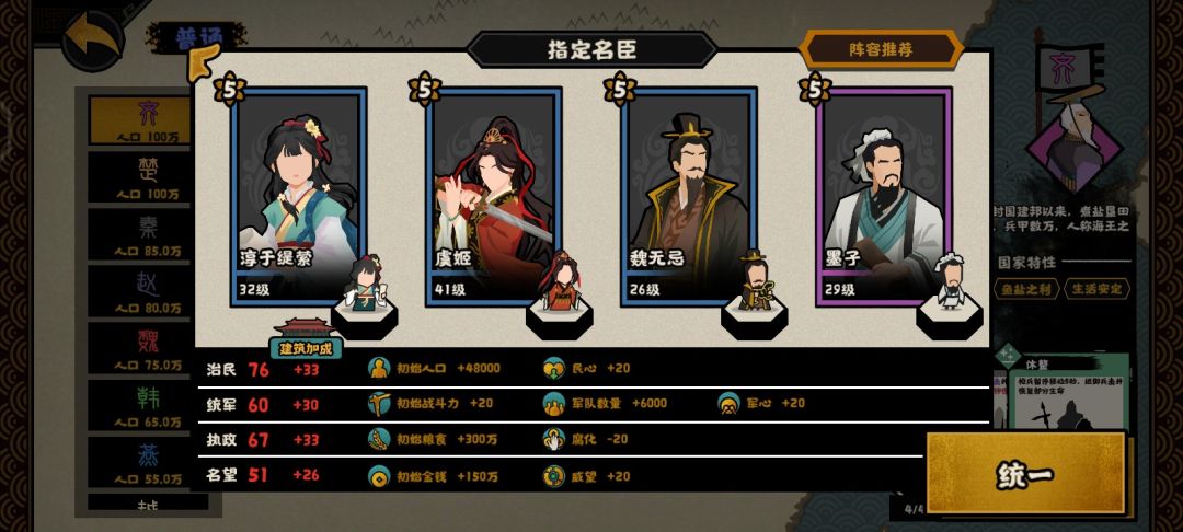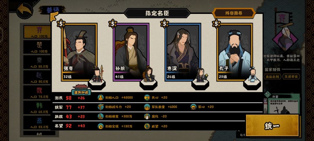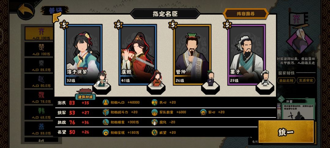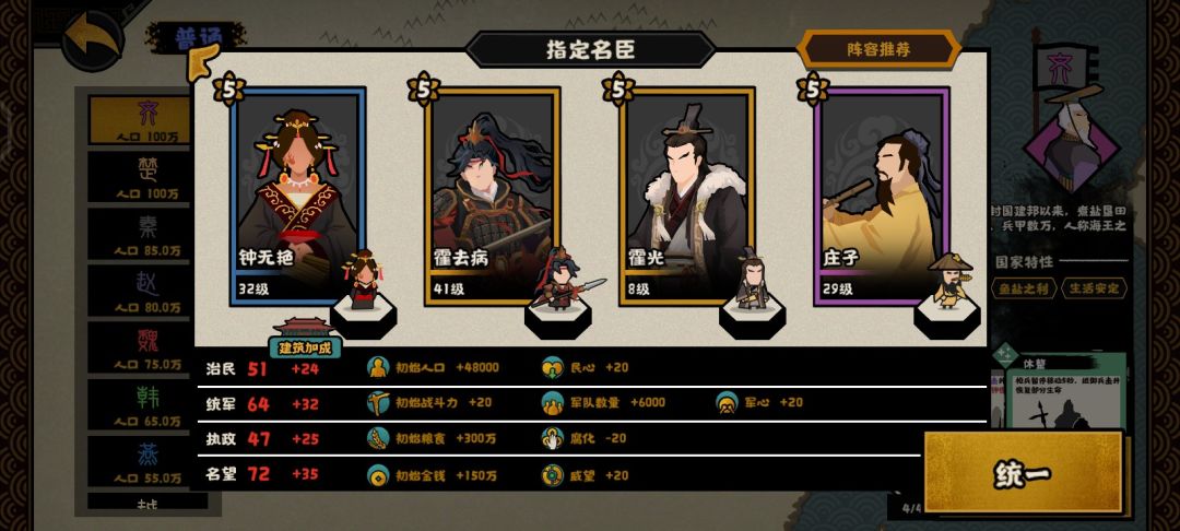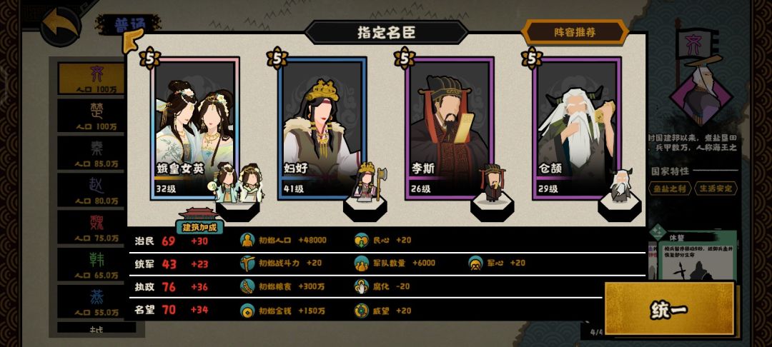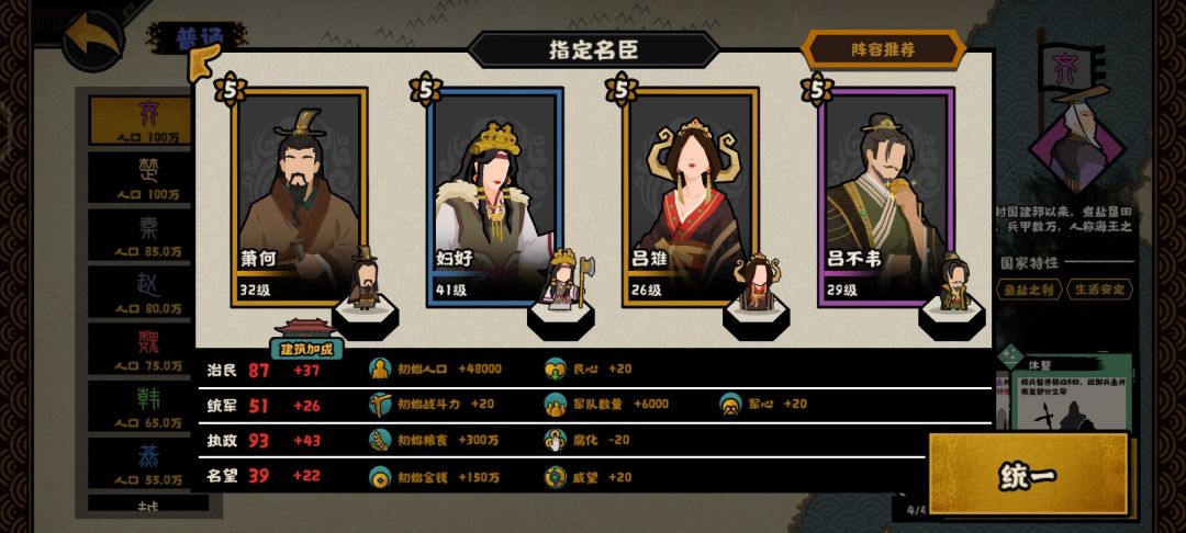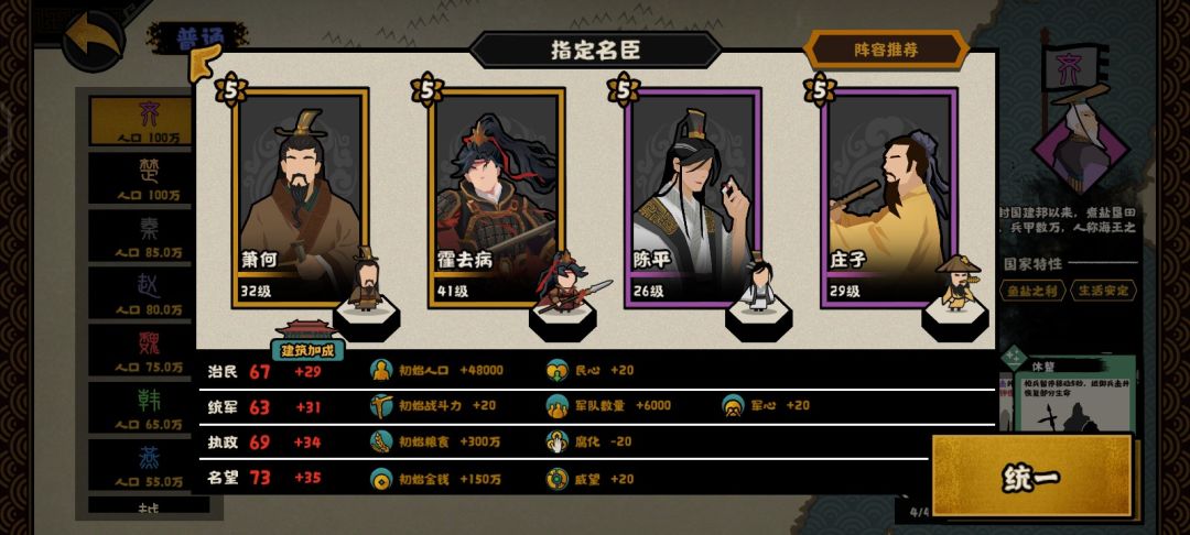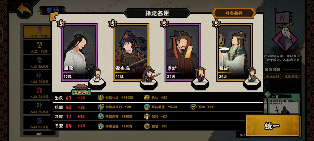 这个是用打大汉匈奴远遁用的,解忧提供50战力,吴起提供120战力,商鞅提供50战力,韩非子提供60战力,再加上开局140的战力,开局420战力直接打匈奴就行