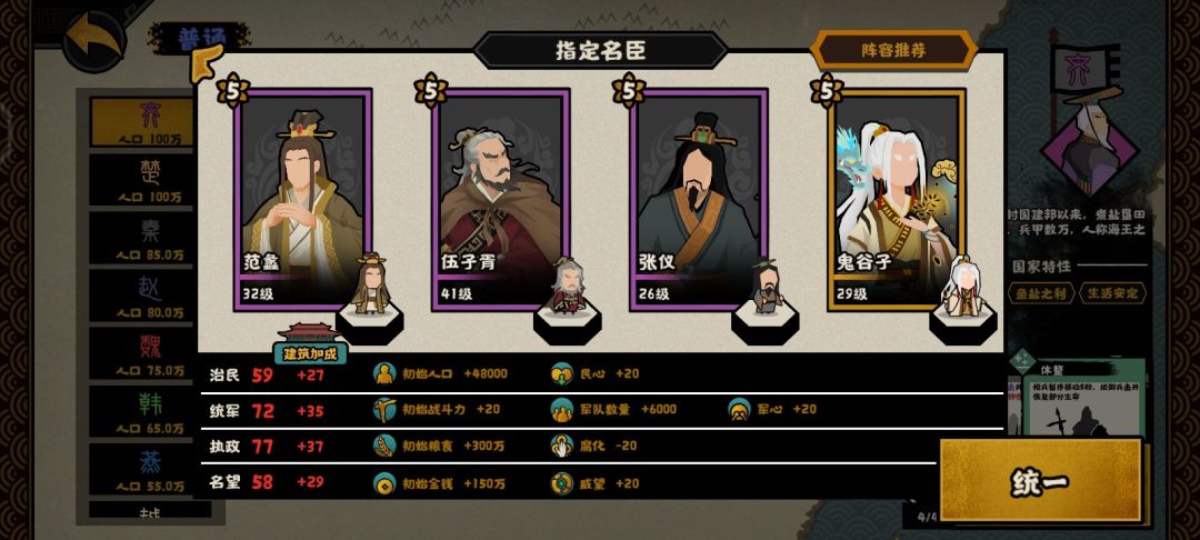 这里则是后期阵容的,因为范蠡+3用间,伍子胥每有1用间等级+6战力,张仪+3用间,鬼谷子+3用间(这些名臣增加用间等级的是需要70威望的时候触发,每个技能需要3士子,这几个名臣所需要的士子就得12士子(鬼谷子还有一个技能需要3士子)一共是9用间),而且春秋战国开始就有政策用间了,用间方面则是用间,破坏,窃取,游说,谣言,刺杀,离间,一共是7用间,需要38士子,如果是吴楚越则需要3马换2用间,三家分晋则是决水再+1用间等级,所以如果是正常剧本,则是16用间,伍子胥一共可以提供96+20的战力(20是伍子胥提供的)如果是三家分晋则是102+20战力,吴楚越则是108+20战力