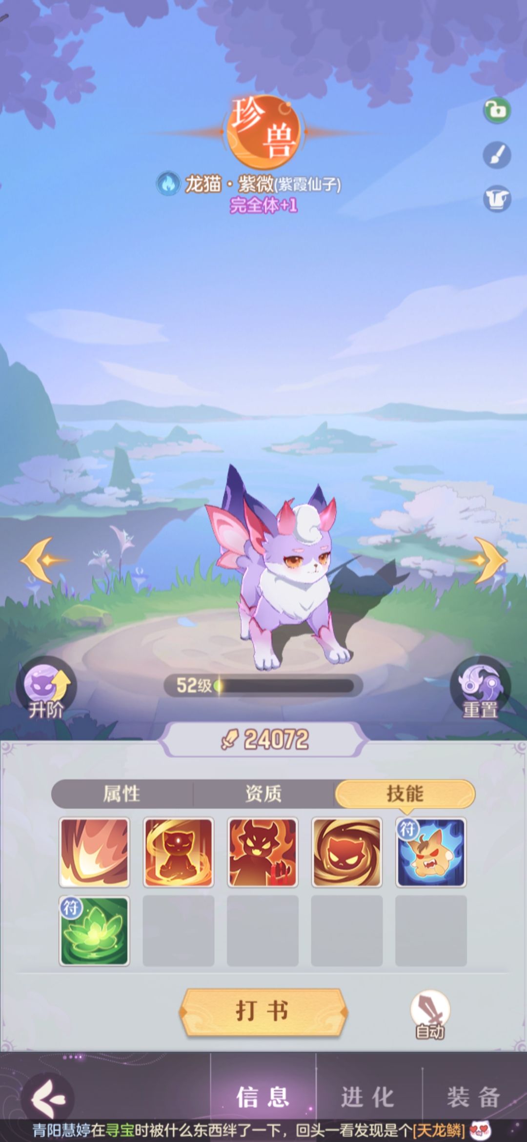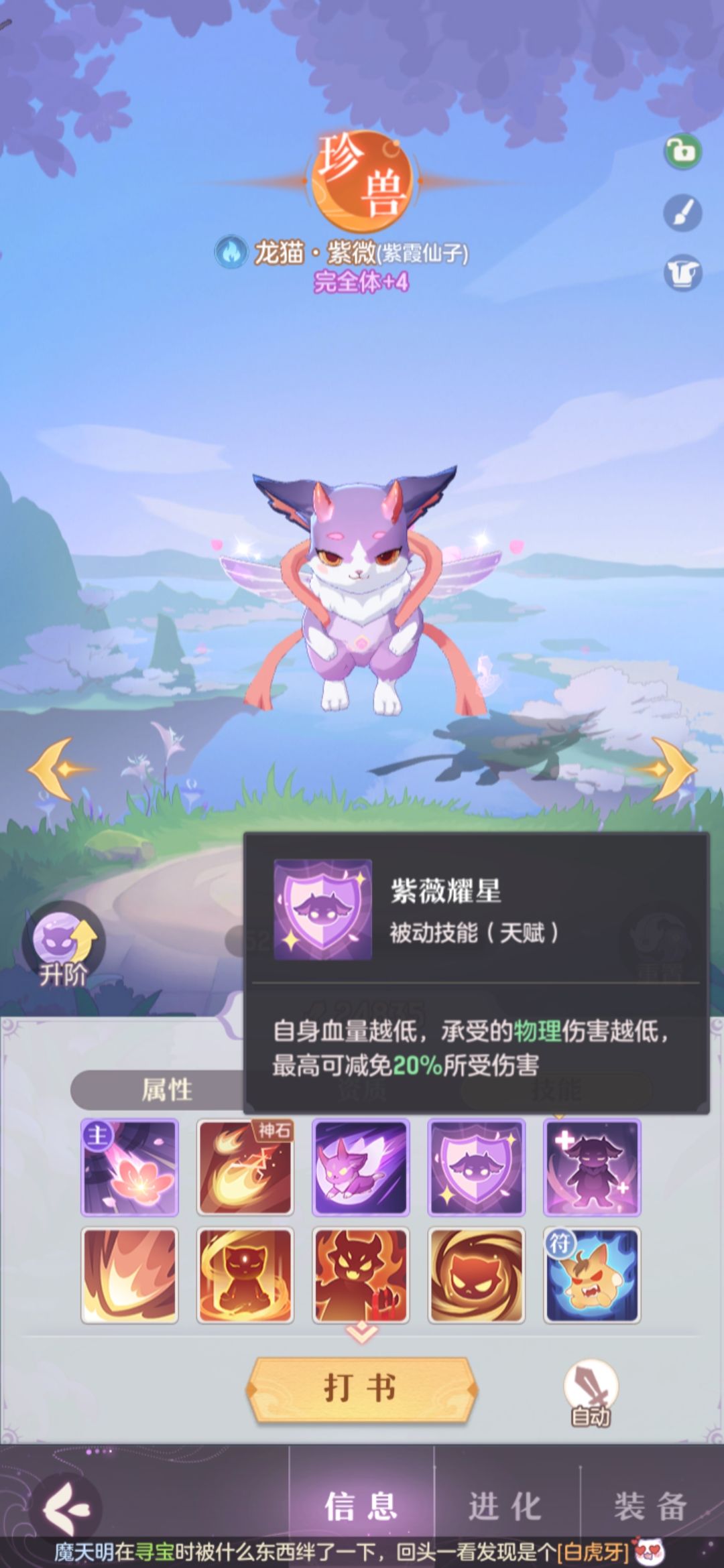 45级珍兽紫薇。一个及其被忽略的宝宝。却有着几乎完美的技能机制,主动①技能:法术群攻主要输出技能。主动②:技能单体法攻。施加禁疗被动。被动③技能:法术攻击吸血百分之二十。被动④技能:物理减伤最高百分之二十。被动⑤技能:受伤害增伤百分之二十五。以上紫薇自带的被动技能很优秀。再打上契合它的技能。(连击—暴击—爆伤—蓄势—报复—(遗忘二技能可以选择高神或者归一体质)加点4智1耐。遗忘主动②技能。(二技能作用并不大,不考虑PK的前提下可以遗忘换技能或者不要报复)可以适当点几点体力拉血量。伤害高。回复多(一口千血)目前物理三刀流根本不可能秒掉紫薇。生存环境好。配合蓄势和报复。伤害也很可观。目前偌大长安极少有人培养它。你要来试试吗?0~0