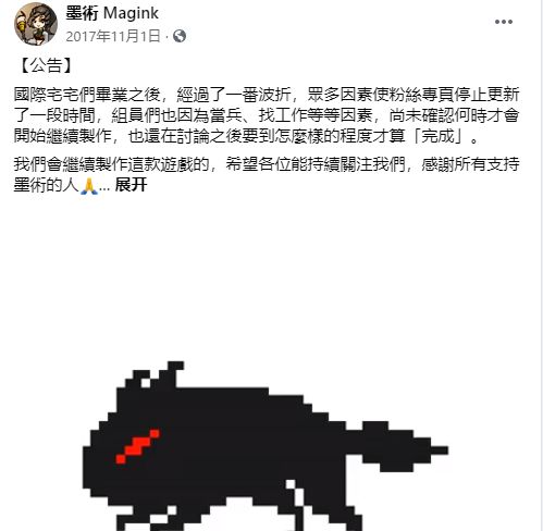 已经停止更新的墨术官方脸书上,现在仍置顶着2017年11月1日的一条贴文。表示国际宅宅们因为毕业后的各种波折,已经暂时无法再继续完成对于《墨术》的完善和更新,却也给了一个虚无缥缈的承诺,“我们会继续制作这款游戏,感谢所有支持墨术的人。”