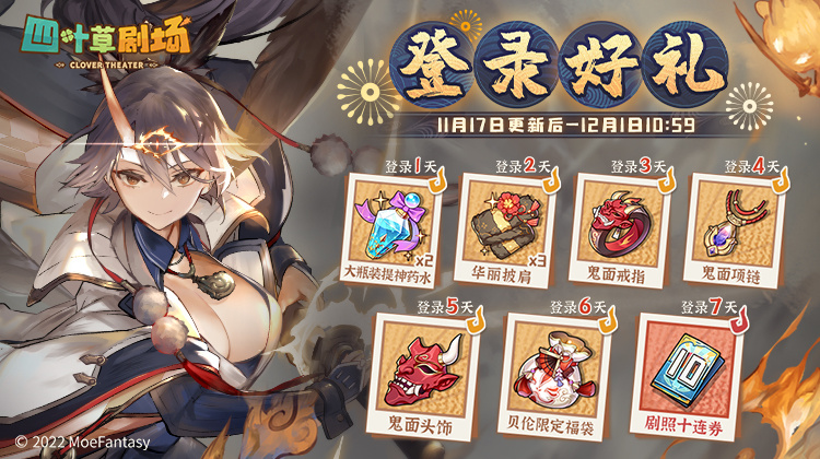 活动期间每日登录游戏,累计7日即可获得全部奖励,内含【剧照十连券