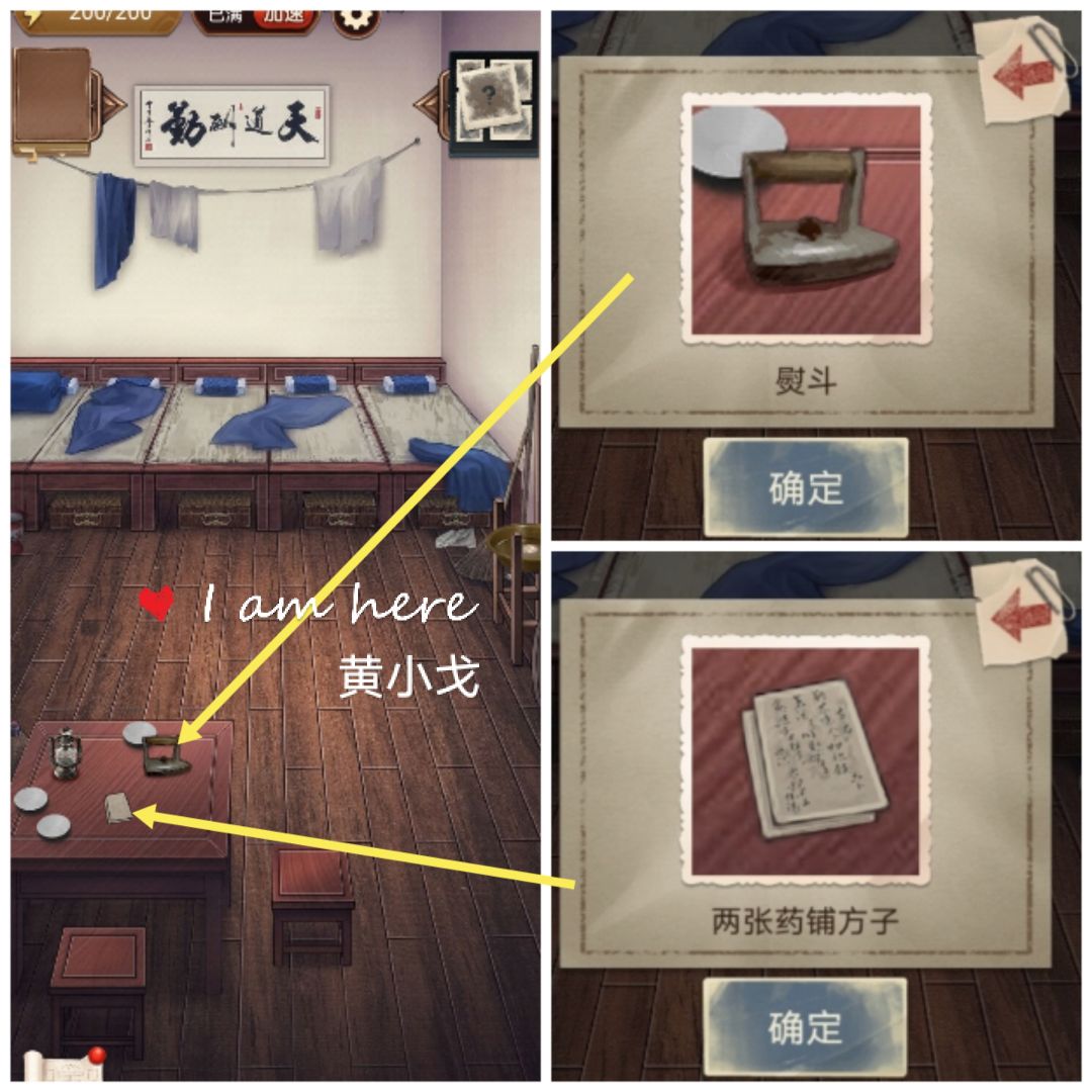 1.桌子:【熨斗】、【两张药铺方子】(询问5体力)