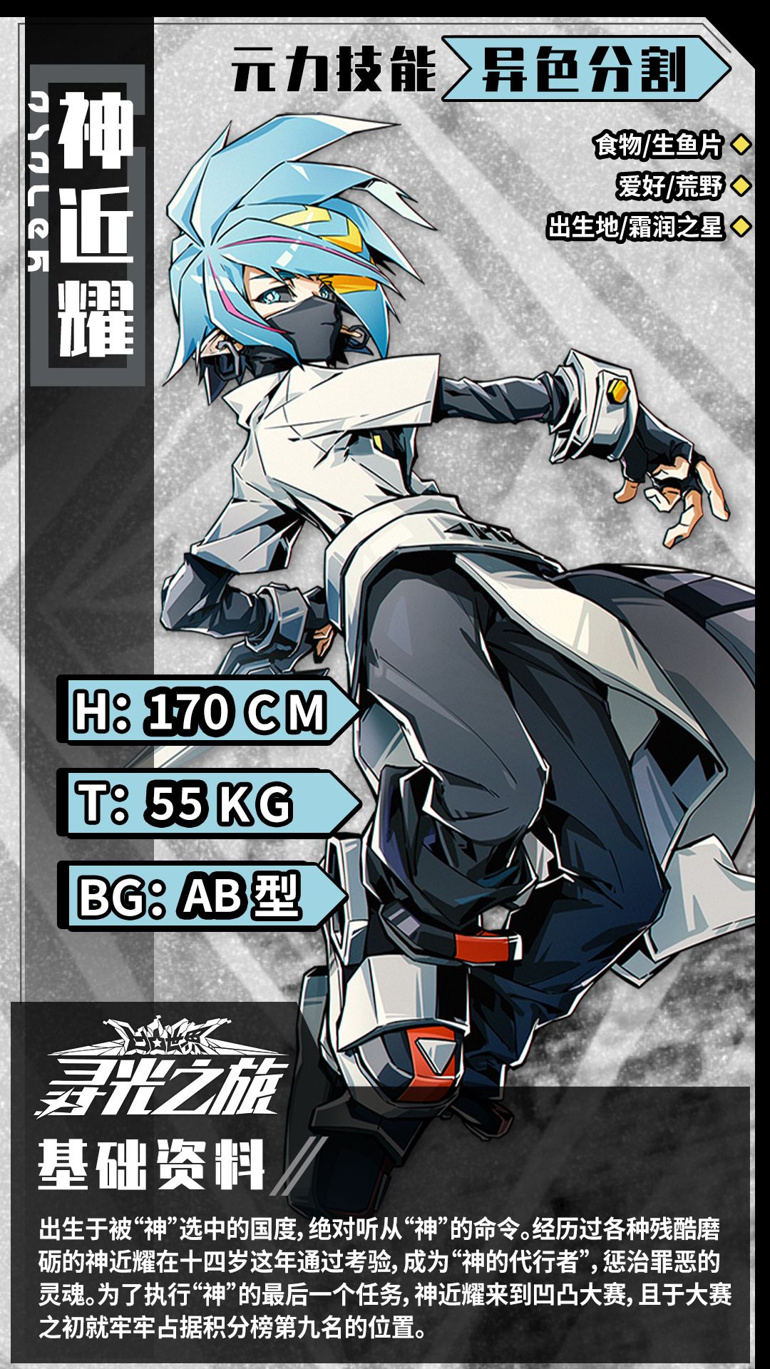 神近耀,出生于被“神”选中的国度,绝对听从“神”的命令。经历过各种残酷磨砺的神近耀在十四岁这年通过考验,成为“神的代行者”,惩治罪恶的灵魂。为了执行“神”的最后一个任务,神近耀来到凹凸大赛,且于大赛之初就牢牢占据积分榜第九名的位置。