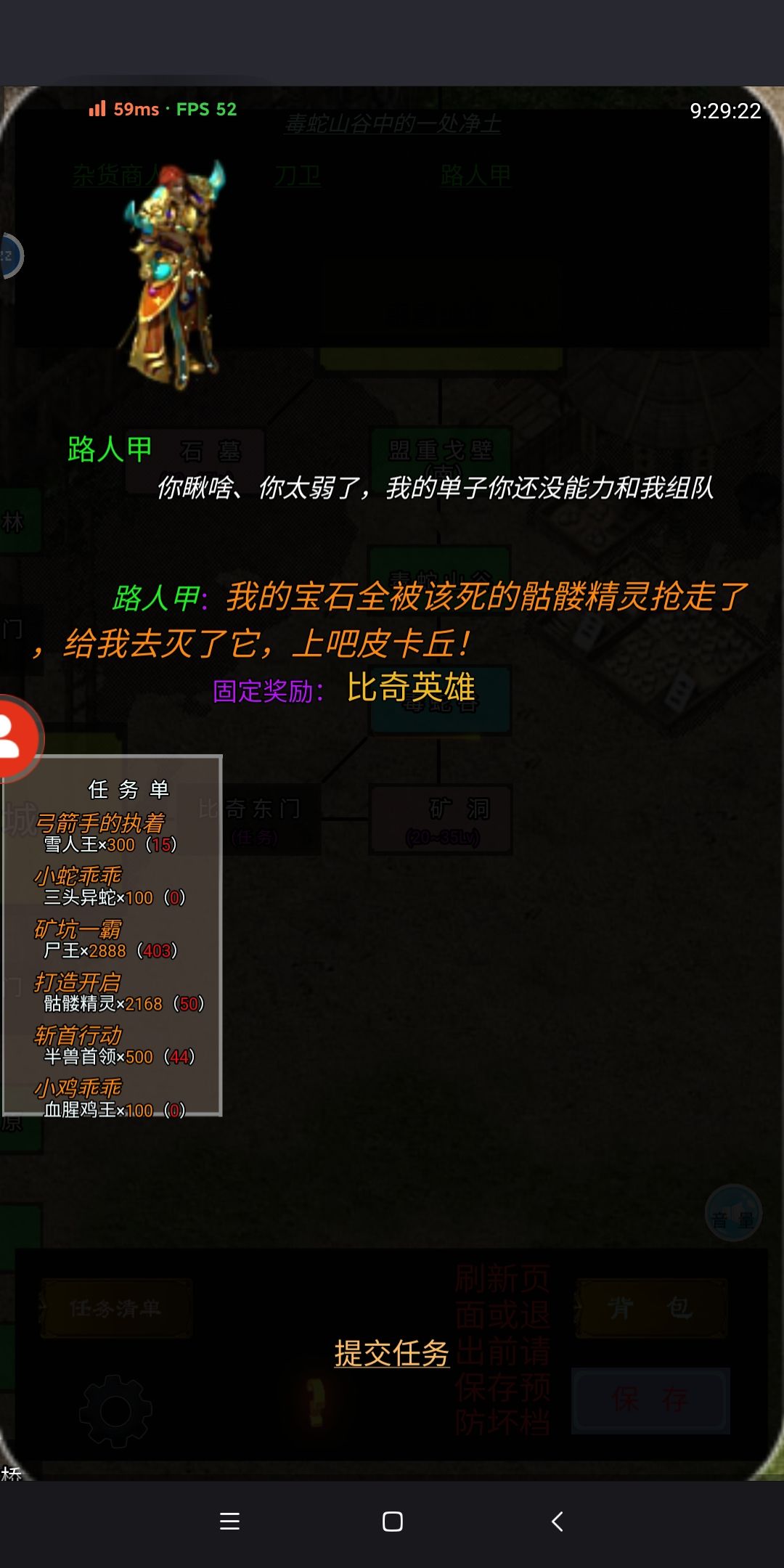②先把村长和青年任务接上,进图开打,技能用单体刺杀剑法,有痒痒挠王者草帽猫妖腰带什么的穿上,进度慢百分之百再杀两个怪就去下一个房间🙎方法 到boos房间然后关闭右下角引怪,然后用刺杀杀左右两边小怪,最后打boos,自己血少一半自己及时补血,我是一把直接过雪人王。然后交任务拿称号。(没出大脚丫不建议刷雪人王,因为你打的非常慢,)