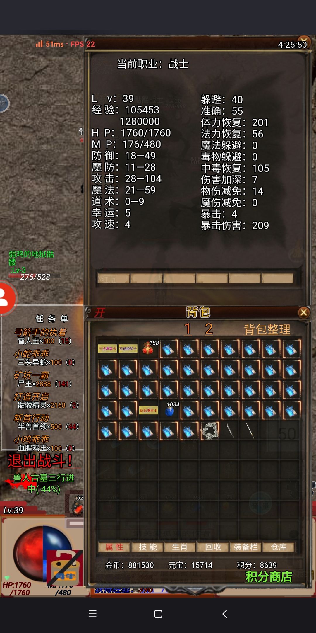 ⑤去矿洞 旁边有任务是杀500僵尸,做完就交,再接,直到会出一个杀25尸王任务,给天魔甲(加大量hp上限) 有技能就学学,有血肉腰带就带上,然后可以买点大太阳水补500血(你要是1700血就设置1300左右,去蛇谷2接称号任务,50只骷髅精灵,装备也就那样,打雪人王打方法打骷髅精灵,打完拿称号, 然后沙土里飞称号直接去积分商店买洛阳铲,称号完成有2000左右hp了。 最多以上步骤3-4小时