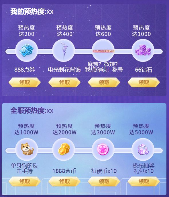 活动期间,完成任务积累预热度,个人预热度和全服预热度达到一定数量后,可在11月18日00:00后分别领取888点券、电光刺花背饰、麻辣?微辣?我想你辣!称号、66钻石、单身狗的反击手持、1888金币、扭蛋币*10、极光抽奖礼包*10等对应奖励~