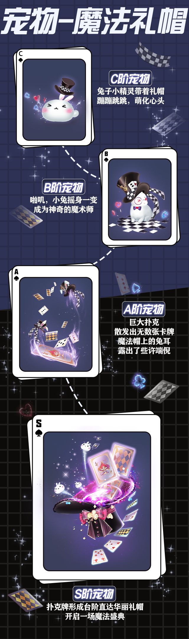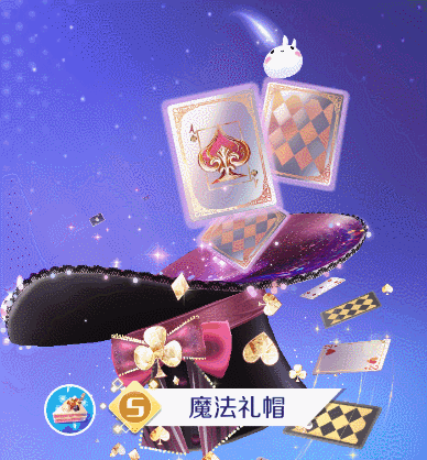 数只萌兔小精灵在华丽的魔法礼帽上蹦跳,扑克牌形成台阶,等待着主人到来,为他心爱的女生表演一场魔术~