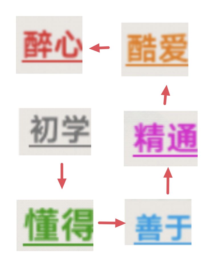醉心>酷爱>精通>善于>懂得>初学