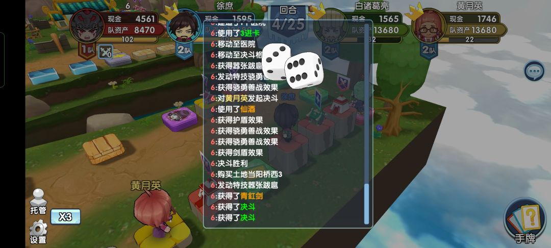 十回合破产徐庶。嚣张跋扈触发三次吸血拿卡,分别在第4、10、24回合,他们的决斗卡被我吸走了三四个,甚至还能吸到他们的武器卡。