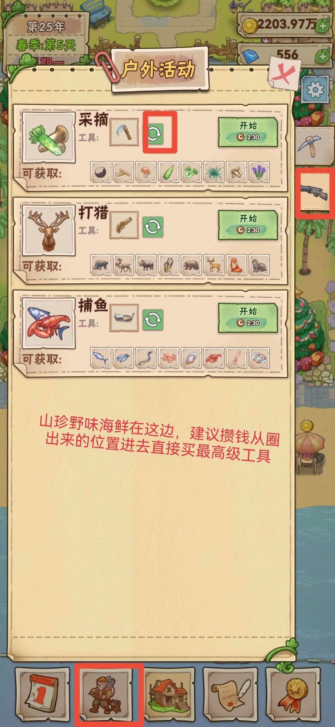 还有个问题,就是有些鱼在水产,需要咱们自己养(鲑鱼,鳟鱼,扇贝,虾,螃蟹)其余全部需要去户外活动捕鱼。