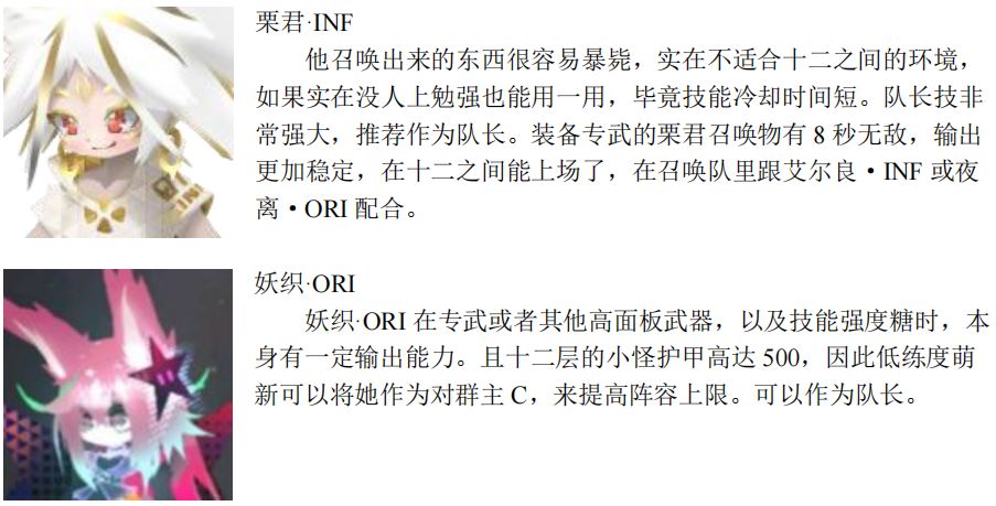 增伤辅助的职责是提升队伍总体伤害,方糖携带冷却缩减与练度较低的主C对轴即可,若冷缩对轴有余,剩下的方糖格携带提升生存能力的方糖。由于本阵容是双C阵容,因此增伤辅助不会携带“妖织”或“妖织·ORI”,因为她们对通关小怪层的帮助并不明显。