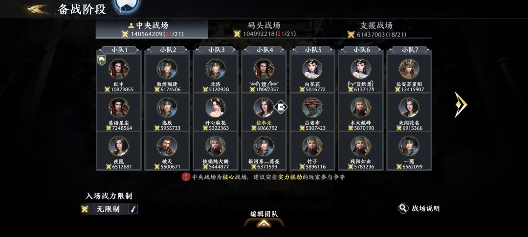 接下来说说人员安排与战略部署,每个战场最多都能配置21名成员,纵向3人为一小队,从左到右分为1-7小队,大家请记好自己所在的战场与小队,下面的安排均以小队作战