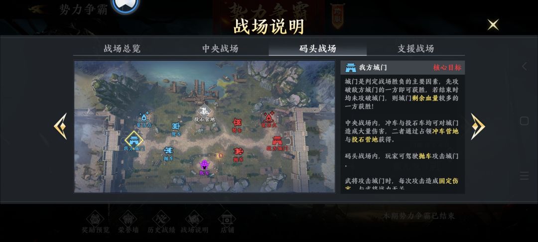 码头战场双方都有三辆小型器械,可对玩家造成大量伤害,必争点分为叛军与投石营地,击杀叛军会直接获得大量辎重,用于升级全体成员属性