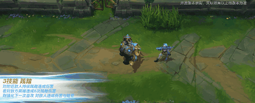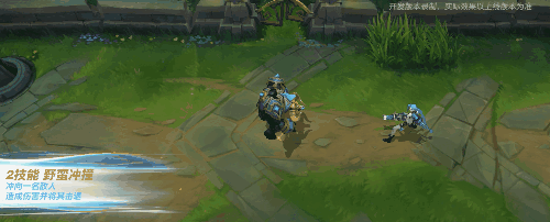 阿利斯塔冲向一名敌人,造成伤害并将其击退,该技能还可对防御塔造成75%伤害。实战时多与Q(1)技能配合使用,通过WQ(21)连招能够打出稳定控制,让阿利斯塔拥有开团能力的同时,还具备了一定反打能力。