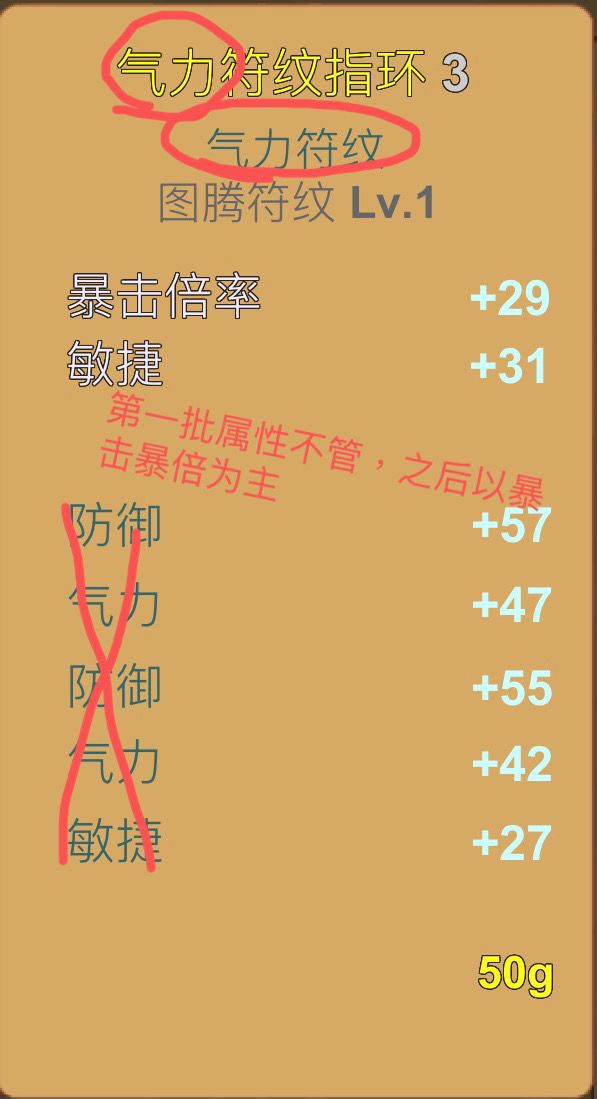 从上图可以得知的是, 我们此时此刻说的是兽环,别把焦点放在套装上,关于气力的加成,一个减50%,,一个加30%,再由 推算而知,我们 最低最低最低的 参考条件是: