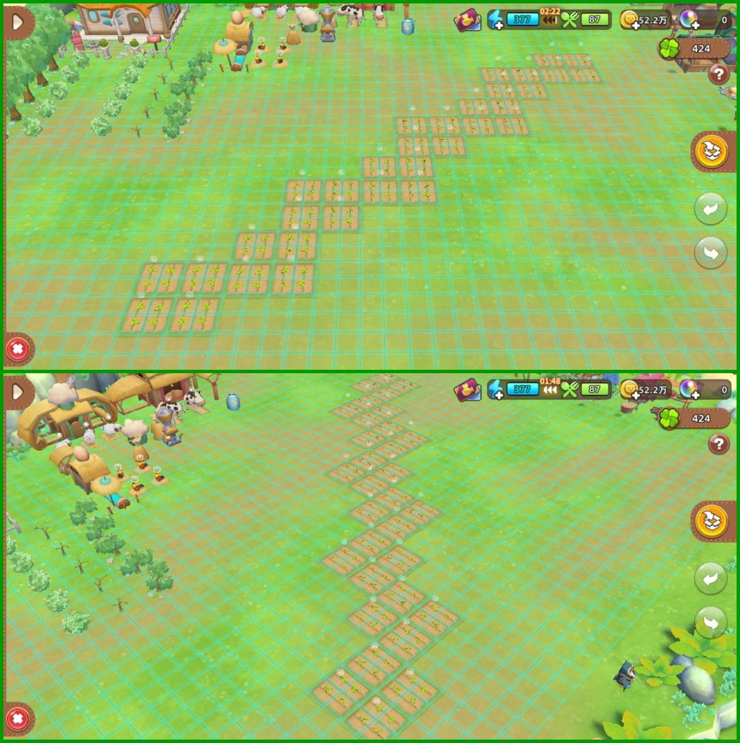 先打开收割机双手模式,再装备收割机,再确认选择种子,再调整梯田与屏幕成垂直方向,但每次调整屏幕垂直度过后,角色必须要垂直上下动一下,否则放下的收割机就会是歪的,相差一些也没关系,推上点下,蛇步走位,若在推的过程中发现收割机歪了,可以通过右侧的方向键点击微调,不要长按,剩下就是练习左右手的协调度了!PS:当角色走过田地却没显示图标的时候,需要退出游戏并且重新登录才能恢复正常,其次网络或手机设备的问题就只能自己看着办吧!