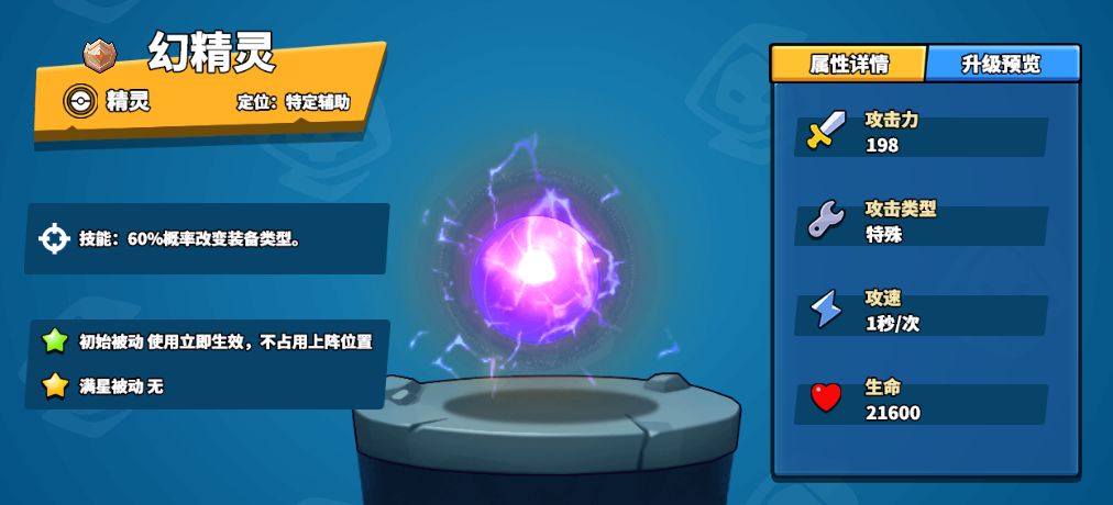 幻精灵的初始技能是60%概率改变装备类型,正是此技能使它在对战和合作中都有不俗的登场率,再也不用担心遇猎人刷魔抗、遇法师刷护甲的尴尬状况了。