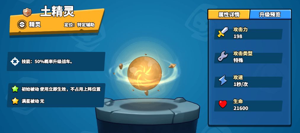 土精灵刚踏进《塔防精灵》世界便展现出它强大的效果—50%概率升级战车。有了它,50金升级六人口不是梦。