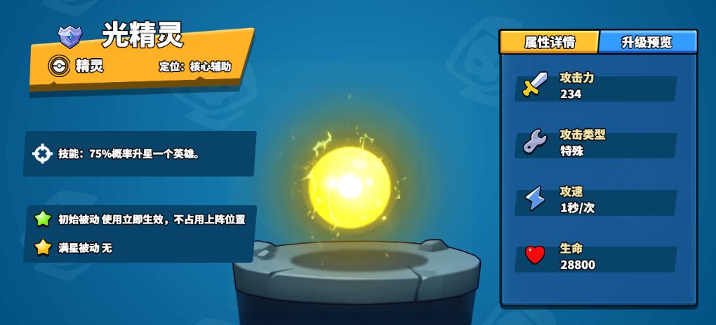 首先是大家最常用的光精灵,初始技能便是概率升级一个随机英雄,大大加速阵容的成型。