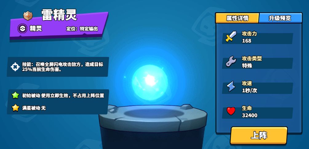 之后就是雷精灵,虽然身为紫卡精灵,比上述精灵品质低,但其作用丝毫不逊色他们,召唤全屏闪电攻击敌方,造成25%当前生命伤害,使其媲美雷神的清场及进攻能力。