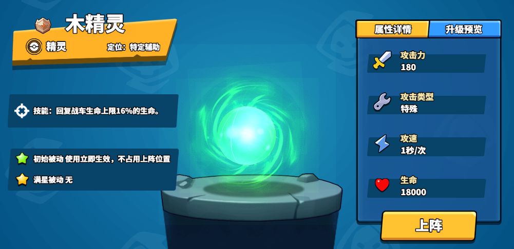 木精灵则是一个防御类精灵,初始技能是回复战车生命上限16%的生命。不同于前两个精灵的随机性,木精灵拥有稳定的效果,时常处于血量劣势时起到至关重要的作用。
