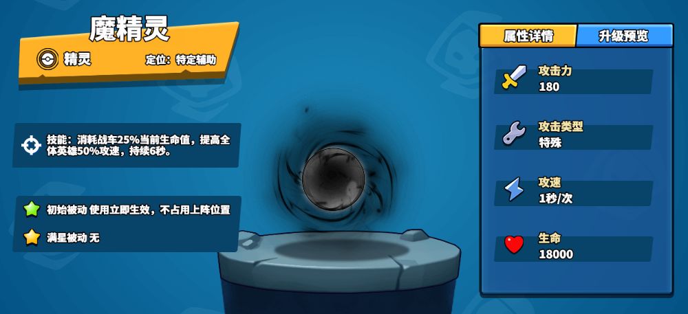 魔精灵如其名,是一个自损八百伤敌一千的特殊精灵—消耗战车25%当前生命值,提高全体英雄50%攻速持续6秒,是背水一战绝地翻盘的利器。