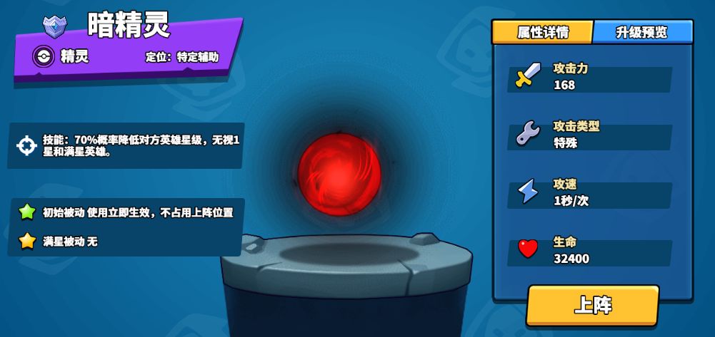 暗精灵作为骚扰类精灵,其强大的debff技能—60%概率降低对方英雄星级,无视1星和满星英雄,能够有效阻碍对手阵容成型,把对手的阵容扼杀在成型前。