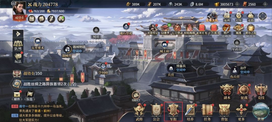 军衔分为:兵卒 伍长 什长 百夫长 千夫长护军 监军 中郎将 牙门将 裨将军玩家满足对应的军衔条件即可进行激活升级完成军衔激活升级后,即可用荣誉币解锁对应军衔特权,军衔可用于激活特权与武将加成效果