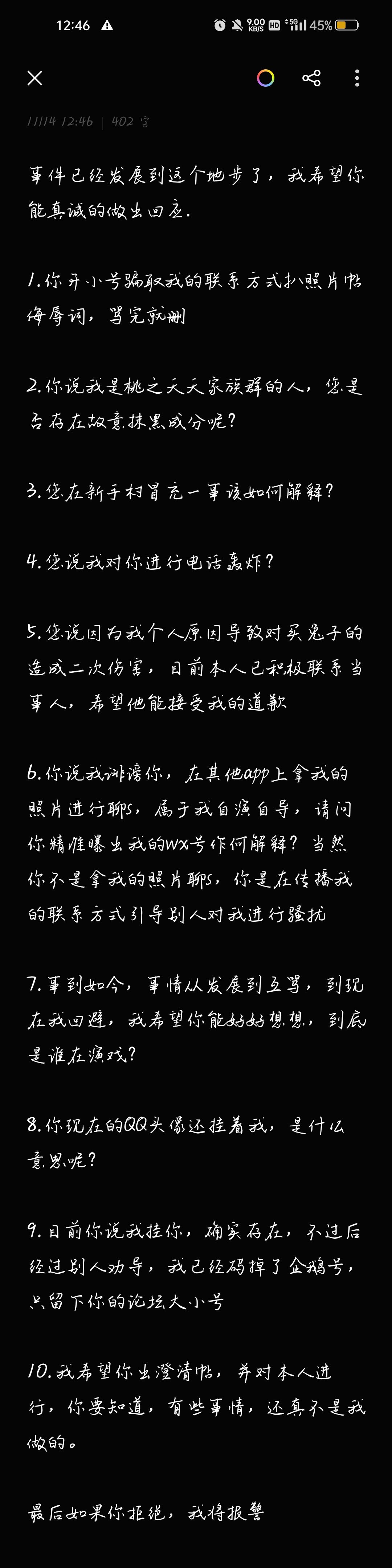 我不和你在说什么了,这件事情,如果我选择报警处理,至于到底是谁的问题,亦或者谁的问题更大,总会有个说法,至于到底是谁造谣,也会有个结果,对骂只是小事,但是照片p图,人格侮辱事大,谁说谁都有理,那就都不说了,交给警察