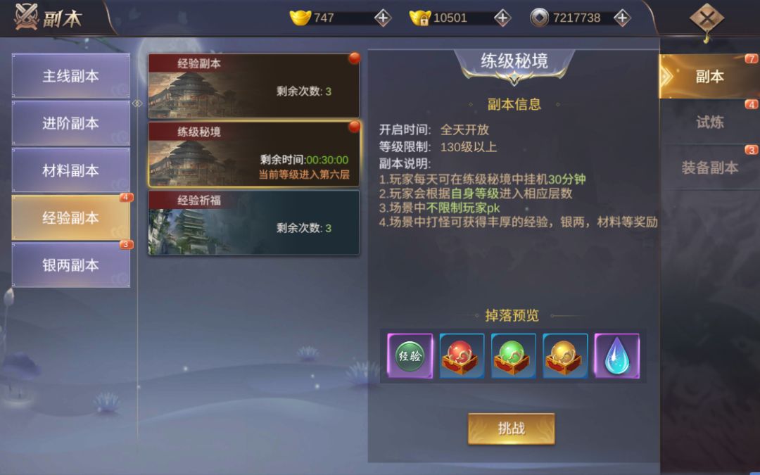 2、 练级秘境每天可以在练级秘境中挂机30分钟,在练级秘境中击杀小怪是在正常地图击杀的几倍经验哦。并且还有银两和材料获取。