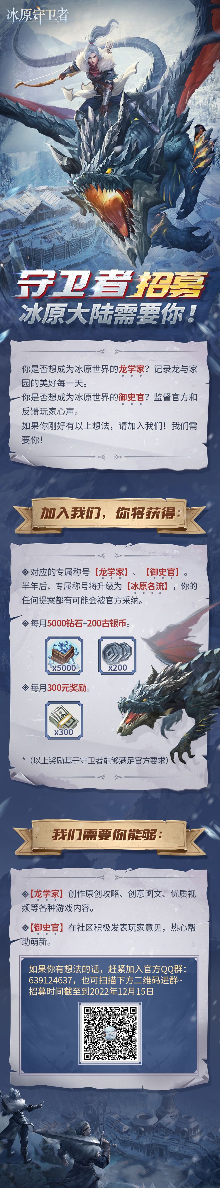 家人们,咱就是说快要一周年了,这一路来有很多玩家陪了大鹅很久,也有很多新鲜血液注入咱们的冰原世界,大鹅知道我们的守卫者们一定各个都卧虎藏龙、身怀绝技!现在有一个施展身手的平台,我们将招募龙学家和御史官,将有机会和策划近距离对线!还能每个月拿工资噢![[嗒啦啦4_好耶]](https://img-tc.tapimg.com/market/images/d378b7a8f38cae2d3dfb6170d918238b.gif)