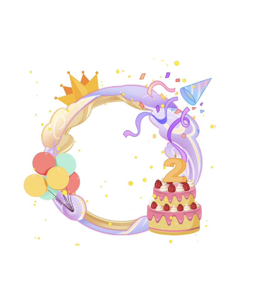 设计思路:金色与王冠呼应,代表上古王冠;紫色代表温馨、浪漫、祝福;蛋糕、彩带、气球等元素突出生日主题。最后祝古古两周年生日快乐!