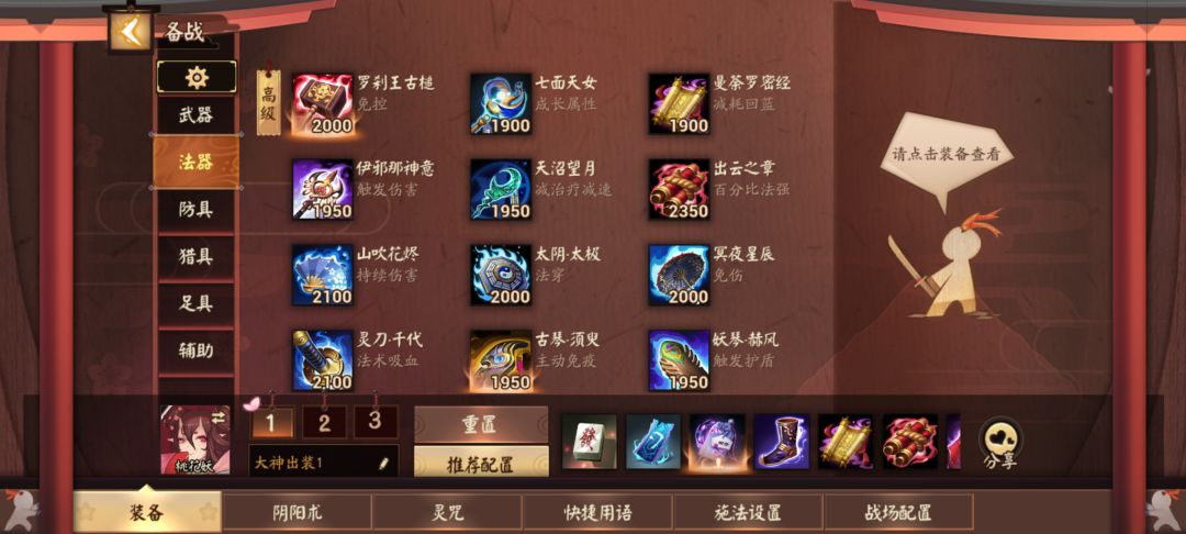 彼梦留痕的问题参照新版辅助装备解析,桃花妖这个式神非常吃法强,1800的彼梦留痕提供的90法强如果出法强小件的奈落玄杖只要850,就算算上10%CD就是再来一本600的古事记,加起来1450还附赠45法强。所以说这件装备的核心价值就是它被动的8%易伤,但这个被动不像伊邪那神意每个单位单独计算CD而是计算桃花妖自己的CD,桃花妖只有三技能有概率能对两个单位同时附加该效果。诚然8%易伤特别好看,但是作为一个提供治疗增益的辅助,你的责任就是回复状态,你给ad多回半条血他那半条血打的伤害比你那8%易伤多一半。这件装备对于桃花妖来说和绝大多数其他辅助一样,好看不好用,不契合式神本身定位,最后四五件做功能出装的时候出可以,前三件成装出严重拖辅助本身的作用。